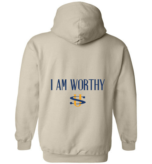I AM WORTHY BLUE LETTERS GILDAN HOODIE