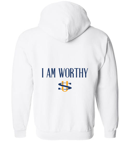 I AM WORTHY WHITE LETTERS GILDAN HOODIE