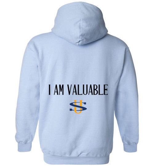 I AM VALUABLE BLUE LETTERS GILDAN HOODIE