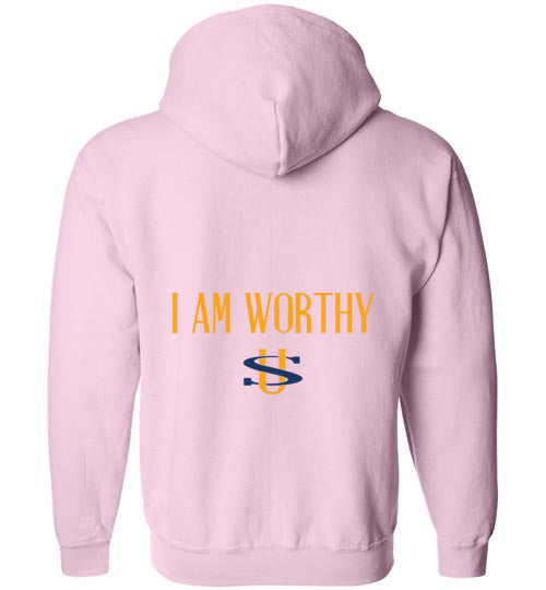 I AM WORTHY WHITE LETTERS GILDAN ZIP HOODIE