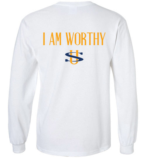 I AM WORTHY WHITE LETTERS GILDAN LONG SLEEVE