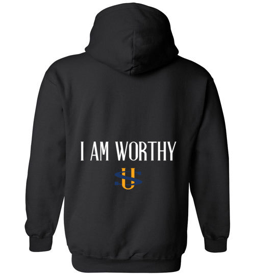 I AM WORTHY WHITE LETTERS GILDAN HOODIE